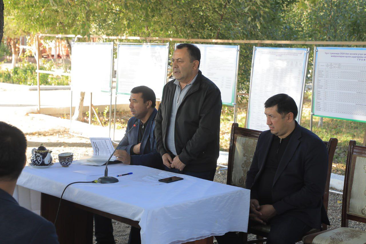 Chust tuman hokimi B. Xamdamov rahbarligida kuz-qish mavsumini betalofat o‘tkazish bo‘yicha ishchi guruh aniqlangan kamchiliklar yuzasidan turar-joy binolari ichki kommunikatsiyalarni ta’mirlash, atrofini obodonlashtirish, yer to‘la qismlarni tartibga keltirish, elektr tizimini joriy ta’mirlash, noqonuniy qurilmalarni buzdirish, gaz tarmoqlari tekshirish va bo‘yash, daraxtlarga shakl berish, oqlash, yer maydonlarini chopish va tozalikni ta’minlash kabi topshiriqlar berilib, topshiriqlarni bajarilishi o‘rganildi.