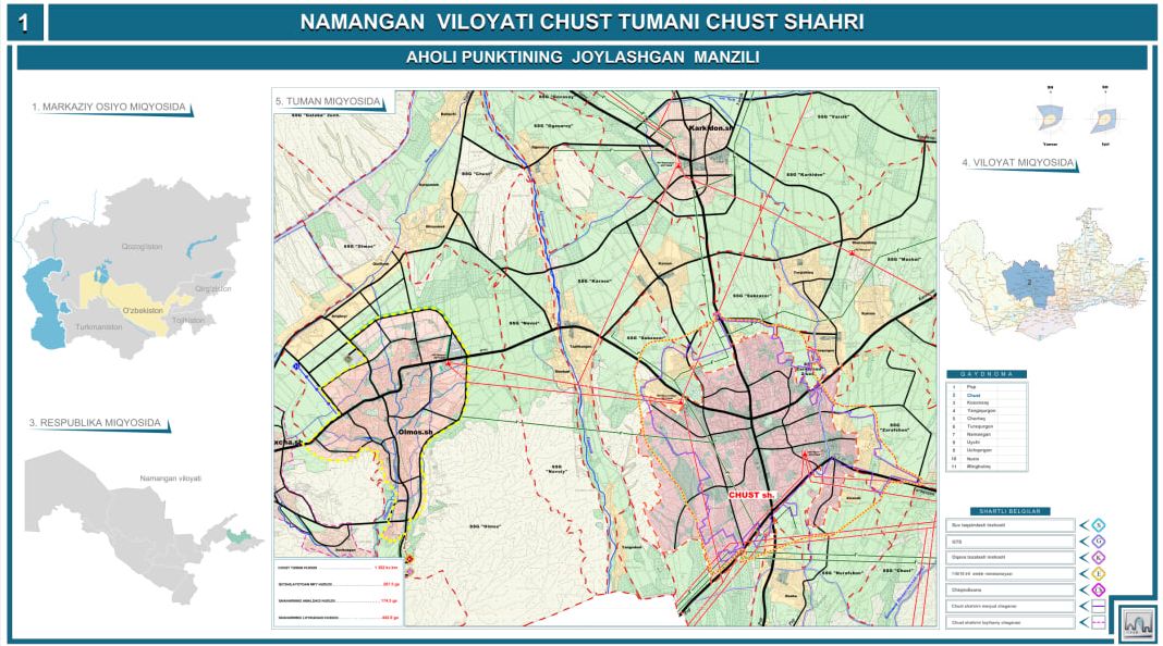 Bosh rejaning asosiy yechimlari, shaharcha hududini ixcham, har tomonlama qulay aholi punktiga aylantirish. Shu maqsad yo‘lida, loyihachilar tomonidan quyidagi ishlar bajarildi: