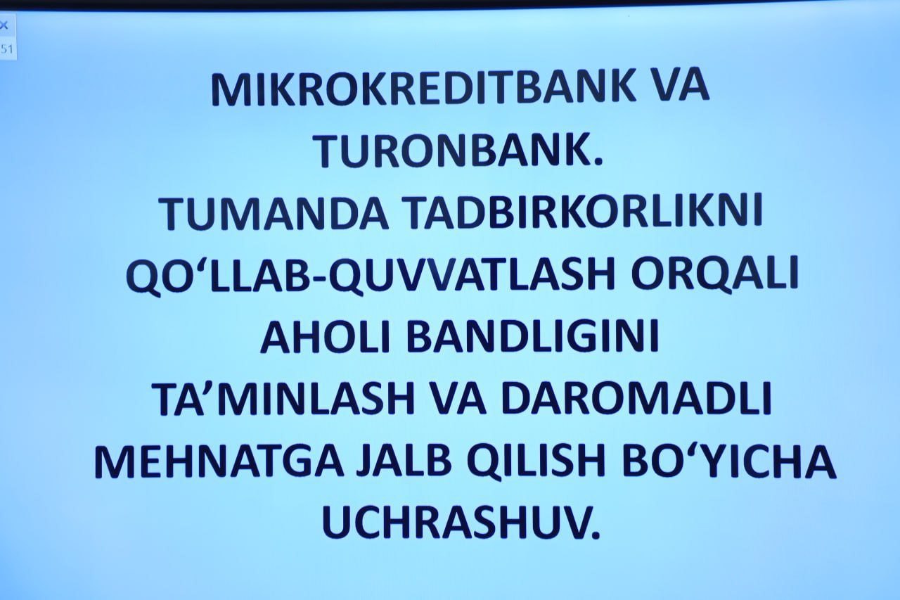 Tadbirkorlikni qo‘llab-quvvatlash orqali aholi bandligini ta'minlash va daromadli mehnatga jalb qilish bo‘yicha Chustlik tadbirkorlar bilan uchrashuv bo‘lib o‘tmoqda.